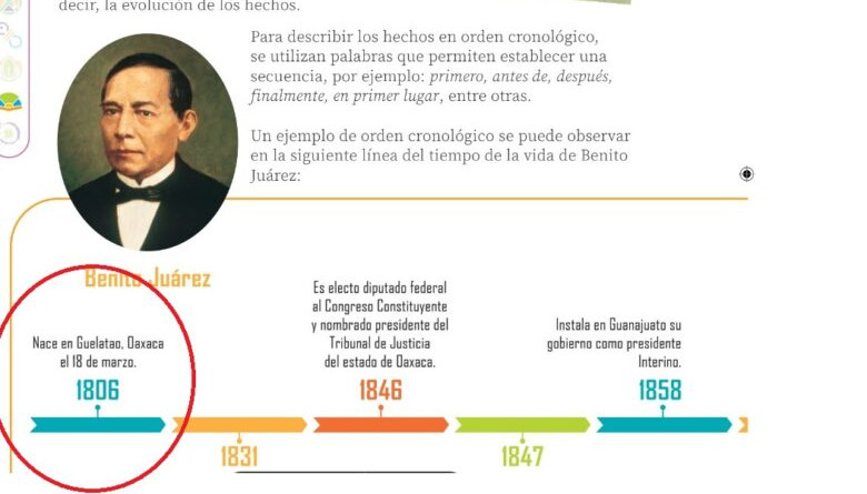 Y ahora en el libro Nuestros Saberes de tercer grado de primaria, exponen el 18 de marzo como fecha oficial del nacimiento del expresidente Benito Juárez.